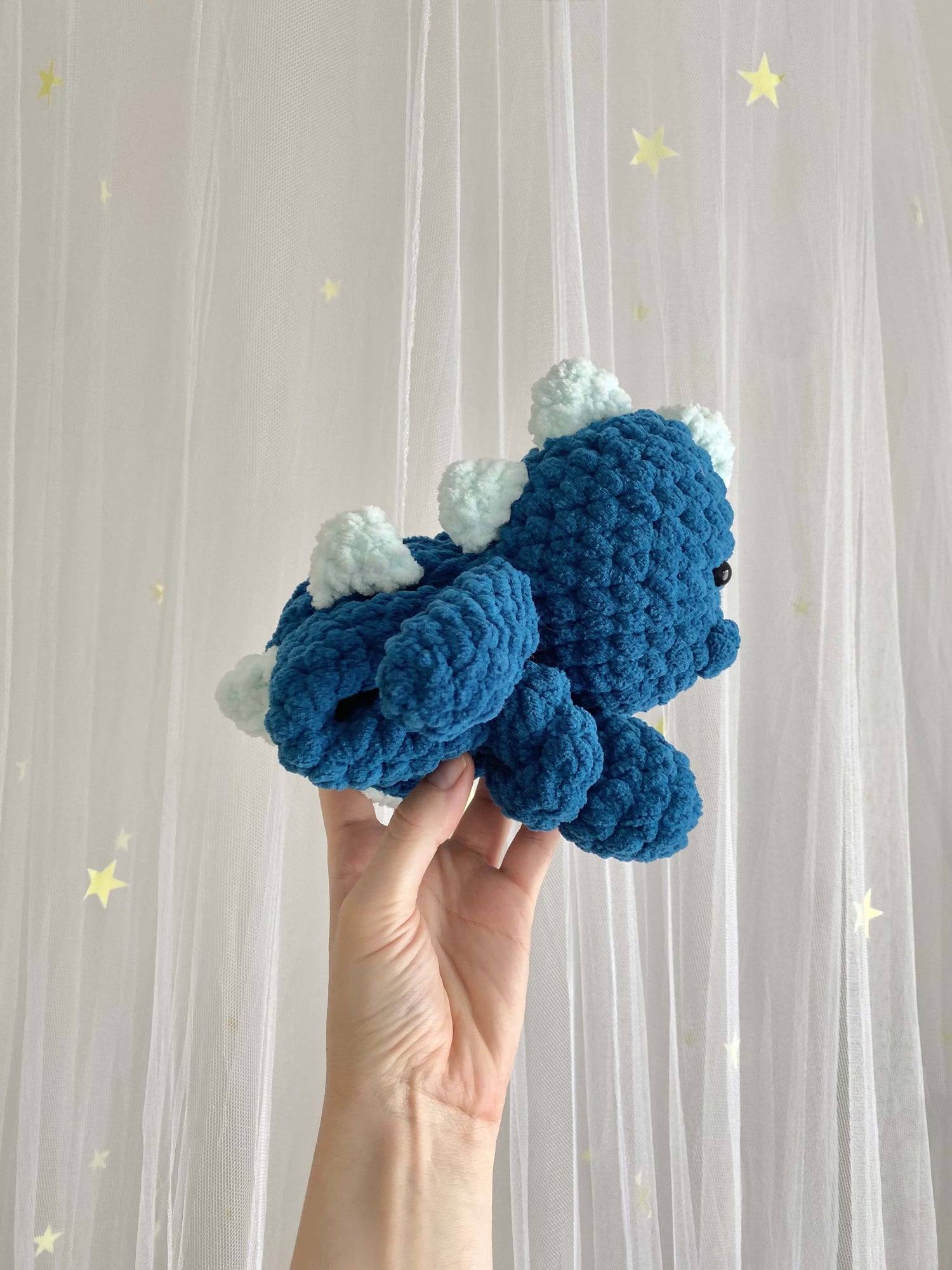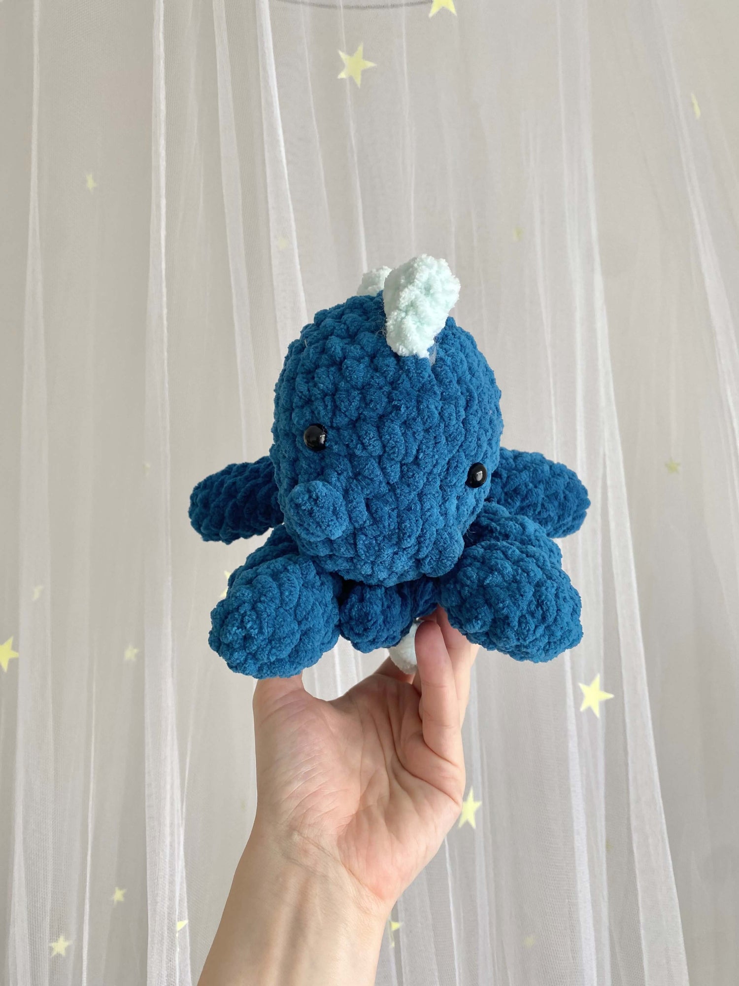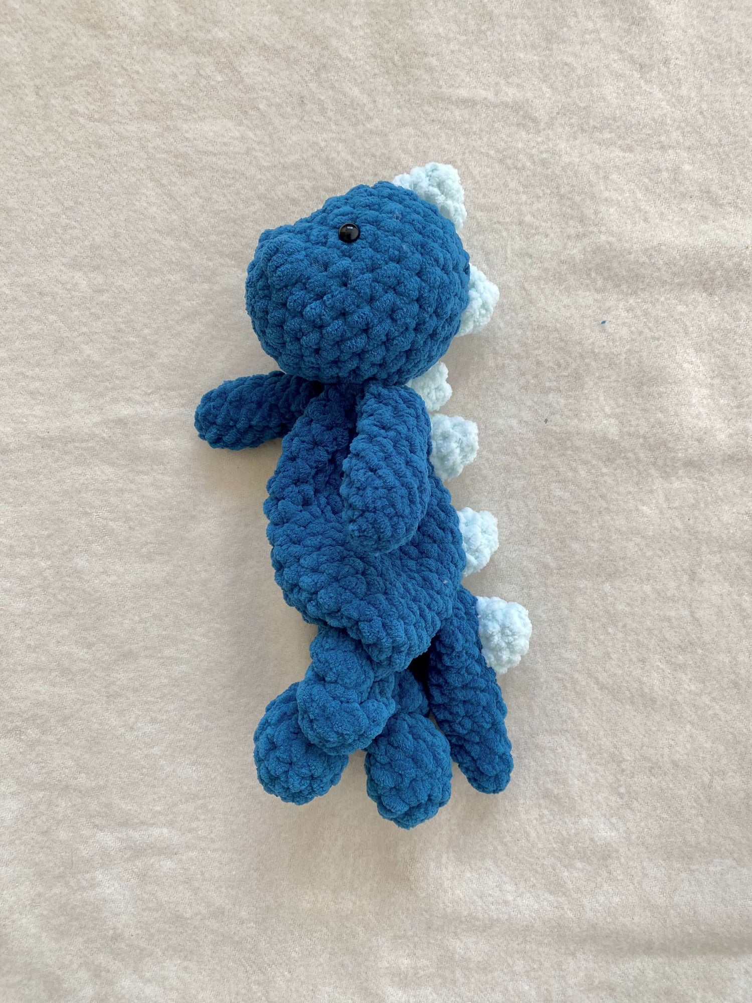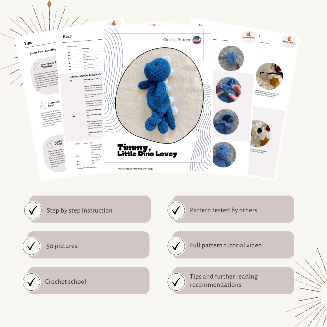 Introducing Timmy, the little T-Rex! This crochet pattern creates a little snuggler dinosaur toy, perfect for little adventurers. Crafted with soft chenille yarn, Timmy offers cuddly comfort and endless playtime fun. Let your child's imagination roam with this delightful knotted lovey, designed to be their loyal companion.